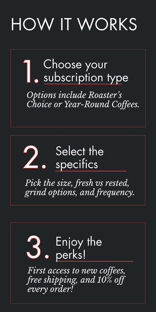 Select your coffee of choice. (Note: For a rotating single origin subscription, choose Roaster's Choice. Individual single origin coffees are not eligible for subscriptions because they change often).